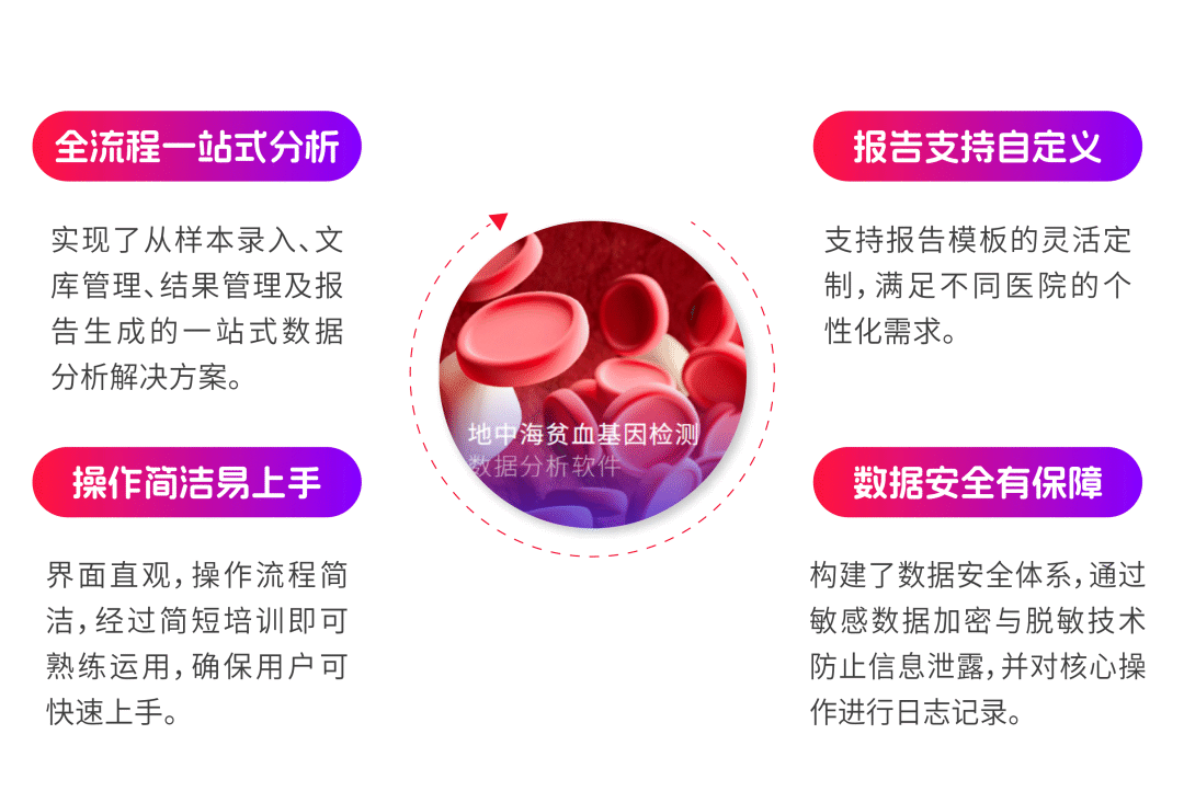 数据分析是地贫临床应用的重要环节,基于CATSA技术的临床实践大数据和AI技术,贝瑞基因开发了适配三代测序仪的地中海贫血基因检测数据分析平台。数据分析平台经30万例样本流转验证,可支持院内本地化部署,自动完成下机数据到临床报告的转化。