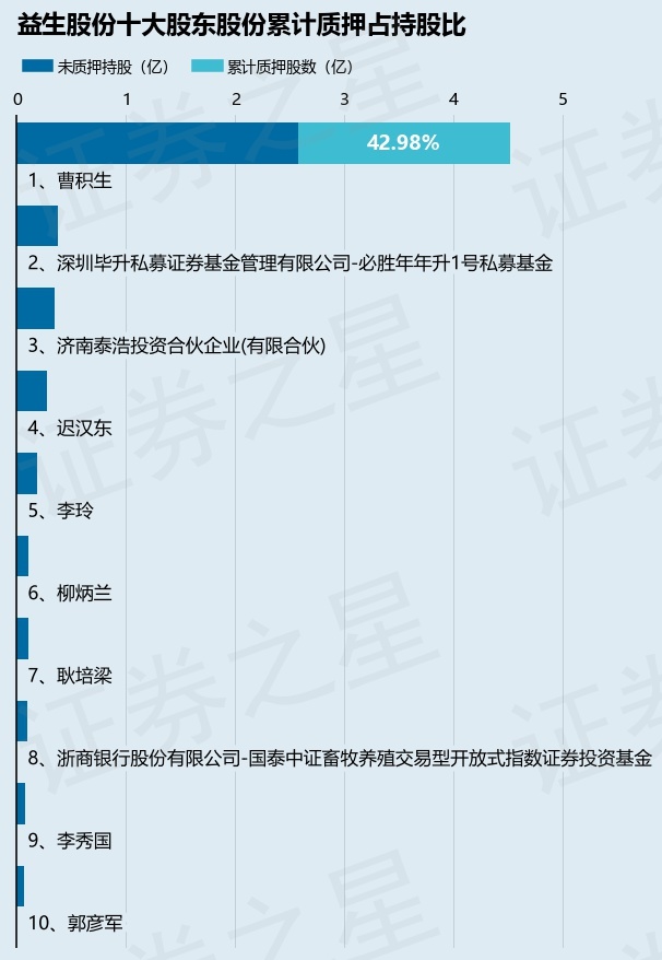 截止本公告日,股东曹积生已累计质押股份1.94亿股,占其持股总数的42.98%。本次质押后益生股份十大股东的累计质押股份占持股比例(占持股比例的计算以公司最新一期财务报表公布的十大股东的持股总数为基准)见下图: