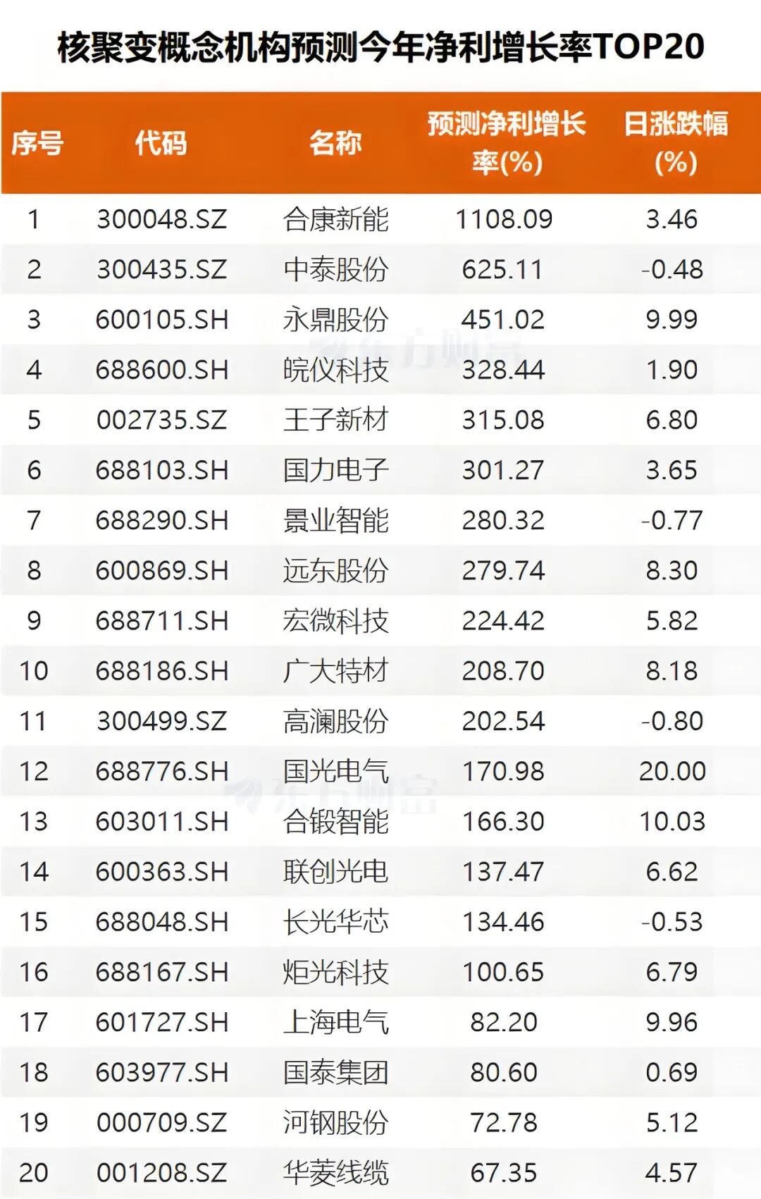 东方财富Choice数据显示,可控核聚变板块中,机构一致预测2025年净利润增长率超100%的总计有16股。