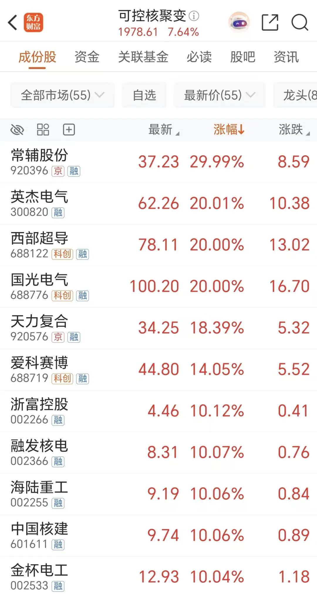 周四(10月9日)可控核聚变概念大涨近8%。个股方面,英杰电气、国光电气、西部超导等多股20CM涨停,爱科赛博涨超14%,中国核建、旭光电子、安泰科技、合锻智能(维权)、永鼎股份、上海电气、厦门钨业等多股涨停。