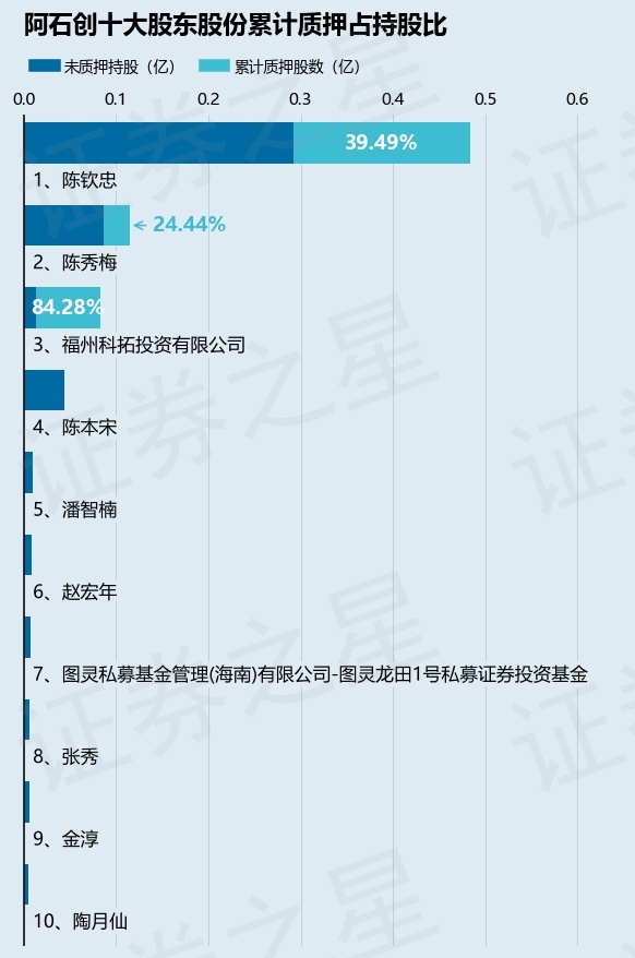 截止本公告日,股东陈钦忠已累计质押股份1908.0万股,占其持股总数的39.49%,股东陈秀梅已累计质押股份280.0万股,占其持股总数的24.44%,股东福州科拓投资有限公司已累计质押股份700.0万股,占其持股总数的84.28%。本次质押后阿石创十大股东的累计质押股份占持股比例(占持股比例的计算以公司最新一期财务报表公布的十大股东的持股总数为基准)见下图:
