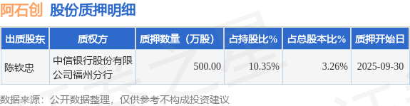 证券之星消息,阿石创(300706)10月9日公开信息显示,股东陈钦忠向中信银行股份有限公司福州分行合计质押500.0万股,占总股本3.26%。质押详情见下表: