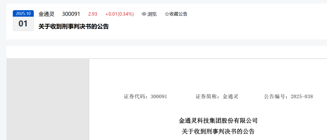 金通灵科技集团股份有限公司(以下简称“金通灵”或“公司”)于2025年9月30日收到上海市第三中级人民法院出具的《刑事判决书》【(2025)沪03刑初67 号】,现将相关情况公告如下: