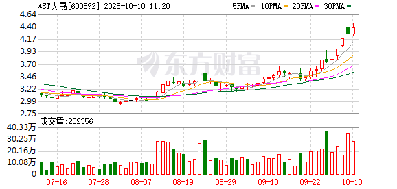 *ST大晟再度涨停,7个交易日内录得4个涨停,累计涨幅为24.51%,累计换手率为30.38%。截至9:42,该股今日成交量1400.88万股,成交金额6179.70万元,换手率2.50%。最新A股总市值达25.01亿元,A股流通市值25.00亿元。