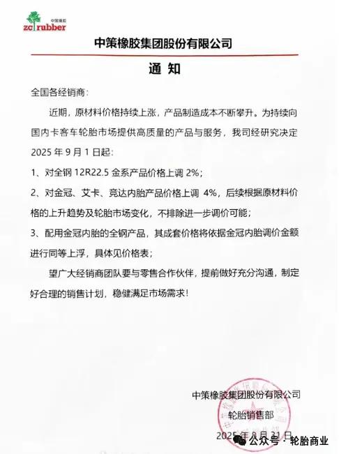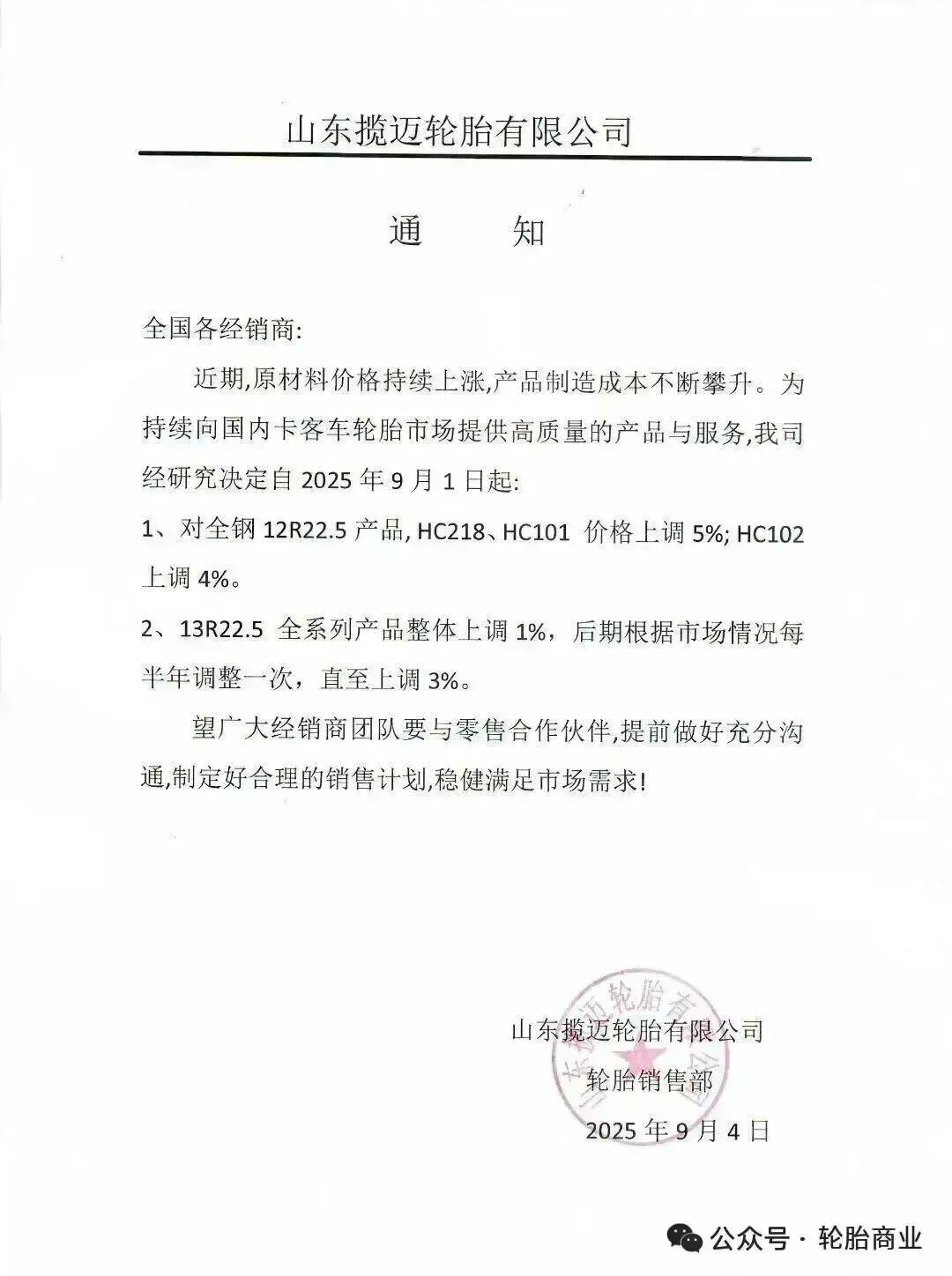 赛轮轮胎销售有限公司发布关于轮胎价格调整的通知表示,自2025年10月1日起对TBR产品价格上调2%-3%。