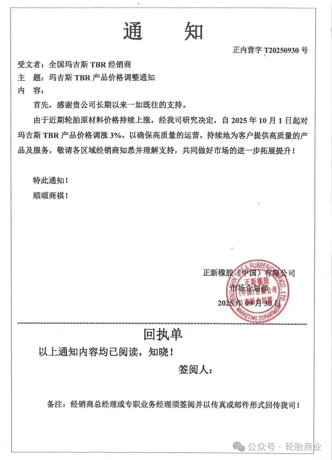 玛吉斯轮胎发布关于TBR产品价格调整的通知,通知表示,由于近期轮胎原材料价格持续上涨,经公司研究决定,自2025年10月1日起,对玛吉斯TBR轮胎产品价格上涨3%。