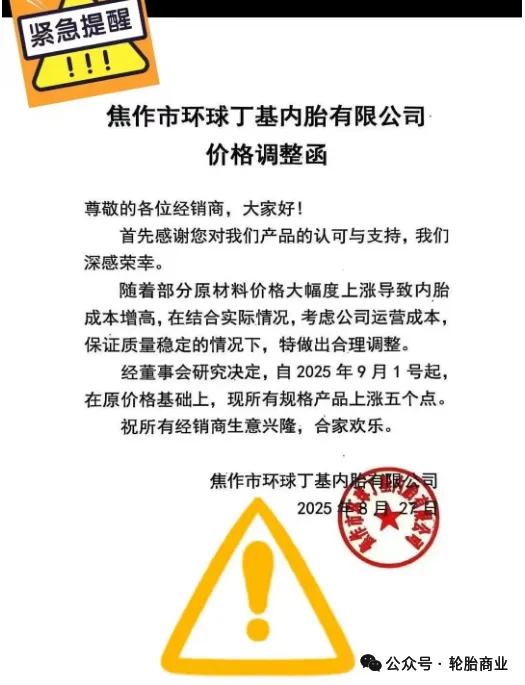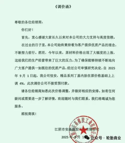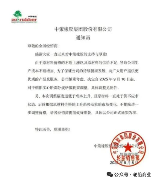 2025年9月份开始有多家轮胎企业先后发布涨价通知。