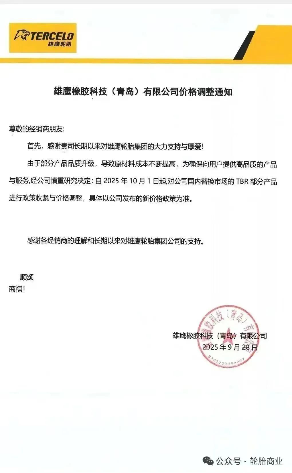 雄鹰橡胶科技(青岛)有限公司发布价格调整通知表示,自2025年10月1日起,对国内替换市场TBR部分产品进行政策收紧与价格调整。