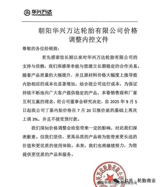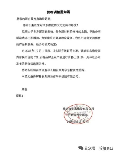 潍坊市华东橡胶有限公司发布价格调整通知表示公司决定自2025年10月1日起,针对华东橡胶国内替换市场TBR所有品牌全系产品价格上调2%。