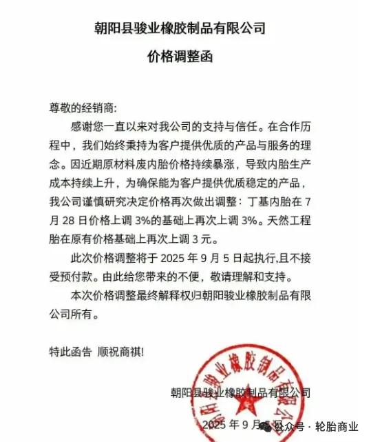 河南天基轮胎有限公司发布涨价通知表示,经公司慎重研究决定自 2025 年 10 月 10 日起,对公司国内市场的 TBR 各产品系列进行价格上调,涨价幅度为 2%,具体调整以公司实际发布的价格政策为准随着原材料价格的波动,后期不排除继续调价的可能。