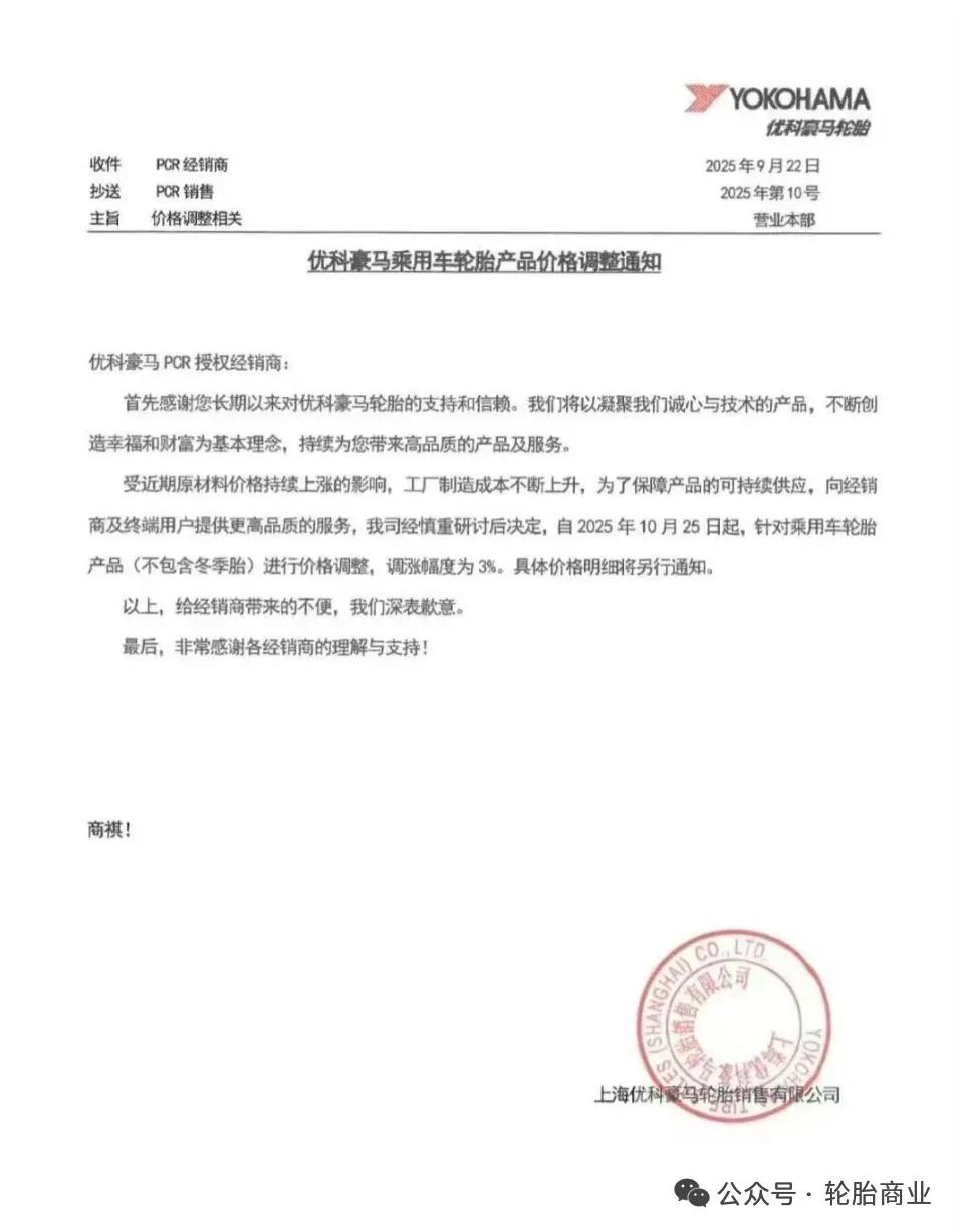 上海优科豪马轮胎销售有限公司发布乘用车轮胎产品价格调整通知表示,自2025年10月25日起,针对乘用车轮胎产品(不含冬季胎)进行价格调整,调涨幅度为3%。