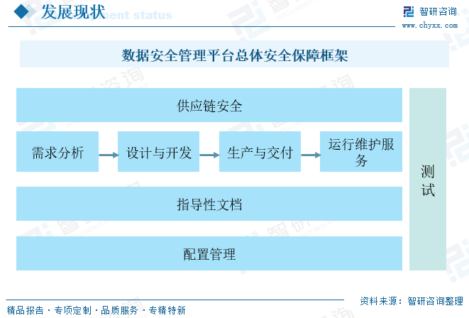在安全保障方面,数据安全管理平台安全保障应考虑供应链安全,贯穿需求分析、设计与开发、生产与交付、运行维护服务等全生命周期各阶段,并加强指导性文档、配置管理、用户信息保护、测试等环节的管理。