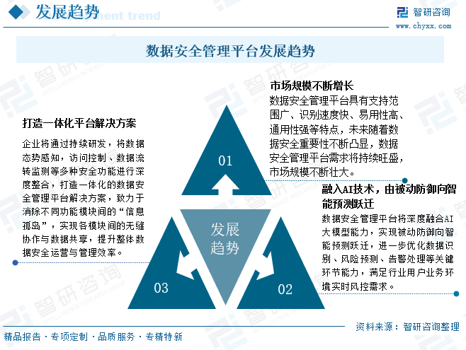 数据安全管理平台具有支持范围广、识别速度快、易用性高、通用性强等特点,未来随着数据安全重要性不断凸显,数据安全管理平台需求将持续旺盛,市场规模不断壮大。同时,数据安全管理平台将深度融合AI大模型能力,实现被动防御向智能预测跃迁,进一步优化数据识别、风险预测、告警处理等关键环节能力,满足行业用户业务环境实时风控需求。此外,企业将通过持续研发,将数据态势感知,访问控制、数据流转监测等多种安全功能进行深度整合,打造一体化的数据安全管理平台解决方案,致力于消除不同功能模块间的“信息孤岛”,实现各模块间的无缝协作与数据共享,提升整体数据安全运营与管理效率。