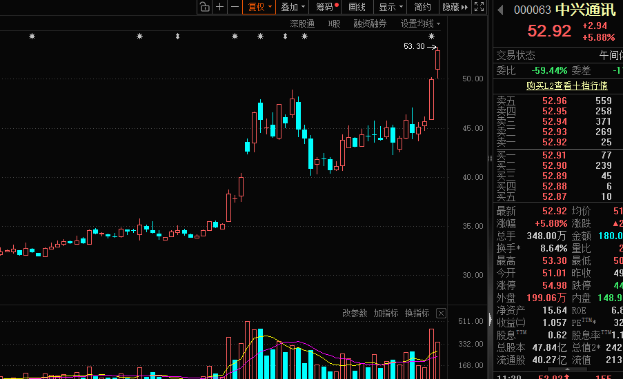 10月10日早盘,中兴通讯(000063)震荡上涨,盘中最高上涨6.64%,报53.3元/股,达到2020年创下的历史高位,午间收盘上涨5.88%,报52.92元/股。中兴通讯早盘成交180.2亿元,金额位居A股第一。