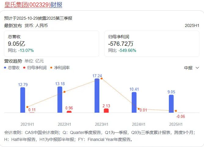 2025年8月25日,皇氏集团发布2025年半年报,财报显示,皇氏集团上半年实现营业收入9.05亿元,同比下降13.07%;归属于上市公司股东的净利润为-576.72万元,与去年同期的128.26万元相比,降幅高达549.66%。