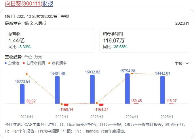 2025年8月28日,向日葵(300111)公布2025年半年报,公司营业收入为1.44亿元,同比下降8.3%;归母净利润为116万元,同比下降35.7%。