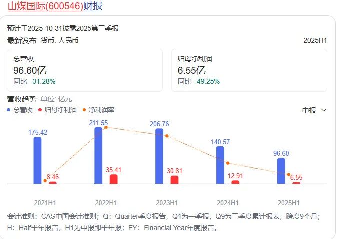2025年7月25日,山煤国际(600546.SH)公告称,公司实现营业收入96.6亿元,较上年同期下降31.28%;归母净利润6.55亿元,较上年同期下降49.25%。