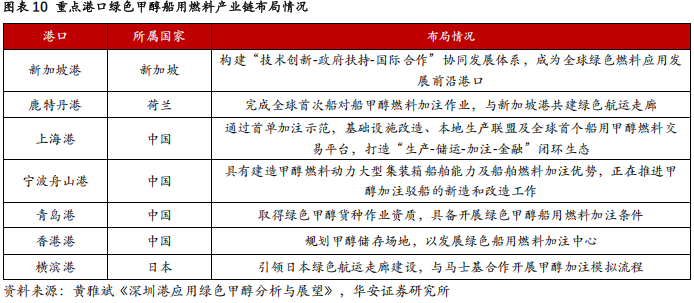 我国积极推广绿色甲醇应用,港口加注业务配套加速。我国先后发布多项政策文件推动绿色甲醇应用,2025 年交通运输等十部门联合发布《关于推动交通运输与能源融合发展的指导意见》,明确提出到2035 年“基本建成交通运输绿色燃料供应体系”的目标。同时,港口改造和加注能力建设也在加速。2024 年 4 月上海港率先打通全流程完成国内首单绿色甲醇船对船加注作业,后续青岛、宁波、深圳等港口均积极推进港口甲醇燃料加注事宜,为甲醇加注业务顺畅落地打通路径。