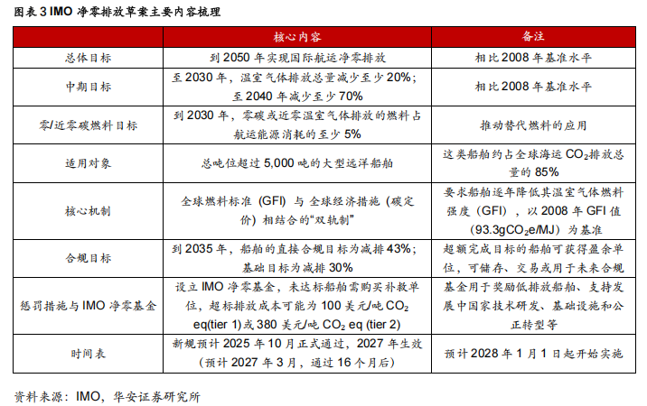 航运业碳排放受到国际重视,IMO 净零排放法案有望在 10 月获得通过,将推动绿色甲醇产业发展。国际海事组织(IMO)在 2025 年 4月通过净零排放框架草案,草案要求航运业 2030 年碳排放比 2008年减少至少 20%,2050 年左右实现净零排放,并可能对未达标船舶征收罚金,该方案有望在 2025 年 10 月举行的海洋环境保护委员会特别会议上得到通过。同时欧盟通过将航运业纳入欧盟碳排放交易体系,促使航运业进行绿色转型。为实现 IMO 和欧盟对航运业绿色转型的目标要求,使用零碳或净零燃料替代传统燃油是最重要的减排手