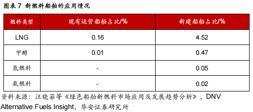 采用甲醇燃料系统船舶订单已成为新型系统主流。由于绿色甲醇在双燃料主机改造方面具有优势,目前绿色甲醇在添加新燃料船舶的占比仅次于 LNG,提供了良好的推广条件。当前,已有手持订单中,新建船舶采用可替代燃料系统的比例仍不到 10%,其中,LNG 占比 4.52%、甲醇燃料占比 0.47%、氨燃料占比 0.02%、氢燃料占比 0.05%。已交付的甲醇动力船以双燃料为主。