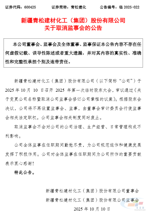 10月10日,青松建化发布公告,公司2025 年第一次临时股东大会,审议通过《关于变更公司名称暨取消公司监事会修订公司章程的议案》。根据股东会决议,公司将不再设置监事会、监事,由董事会审计委员会行使监事会相关法定职权。公司监事会相关制度同时废止。