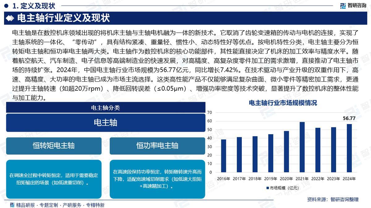 市场规模:电主轴作为数控机床的核心功能部件,其性能直接决定了机床的加工效率与精度水平。随着航空航天、汽车制造、电子信息等高端制造业的快速发展,对高精度、高复杂度零件加工的需求激增,直接推动了电主轴市场的持续扩张。2024年,中国电主轴行业市场规模为56.77亿元,同比增长7.42%。在技术驱动与产业升级的双重作用下,高速、高精度、大功率的电主轴已成为市场主流选择。这类高性能产品不仅能够满足复杂曲面、微小零件等精密加工需求,更通过提升主轴转速(如超20万rpm)、降低回转误差(≤0.05μm)、增强功率密度等技术突破,显著提升了数控机床的整体性能与加工能力。