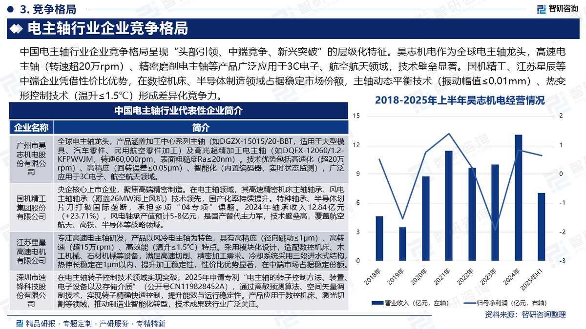 竞争情况:中国电主轴行业企业竞争格局呈现“头部引领、中端竞争、新兴突破”的层级化特征。昊志机电(维权)作为全球电主轴龙头,高速电主轴(转速超20万rpm)、精密磨削电主轴等产品广泛应用于3C电子、航空航天领域,技术壁垒显著。国机精工、江苏星辰等中端企业凭借性价比优势,在数控机床、半导体制造领域占据稳定市场份额,主轴动态平衡技术(振动幅值≤0.01mm)、热变形控制技术(温升≤1.5℃)形成差异化竞争力。