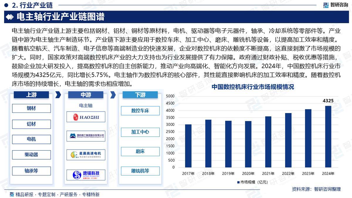 产业链核心节点:随着航空航天、汽车制造、电子信息等高端制造业的快速发展,企业对数控机床的依赖度不断提高,这直接刺激了市场规模的扩大。同时,国家政策对高端数控机床产业的大力支持也为行业发展提供了有力保障。政府通过财政补贴、税收优惠等措施,鼓励企业加大研发投入,提高数控机床的自主创新能力,推动产业向高端化、智能化方向发展。2024年,中国数控机床行业市场规模为4325亿元,同比增长5.75%。电主轴作为数控机床的核心部件,其性能直接影响机床的加工效率和精度。随着数控机床市场的持续增长,电主轴的需求也相应增加。