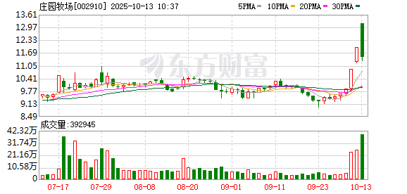 庄园牧场盘中涨停,已连收3个涨停板,截至9:30,该股报13.15元,换手率5.55%,成交量949.56万股,成交金额1.25亿元,涨停板封单金额为3.22亿元。连续涨停期间,该股累计上涨33.23%,累计换手率为34.71%。最新A股总市值达25.71亿元,A股流通市值22.49亿元。