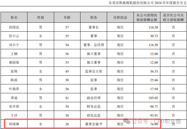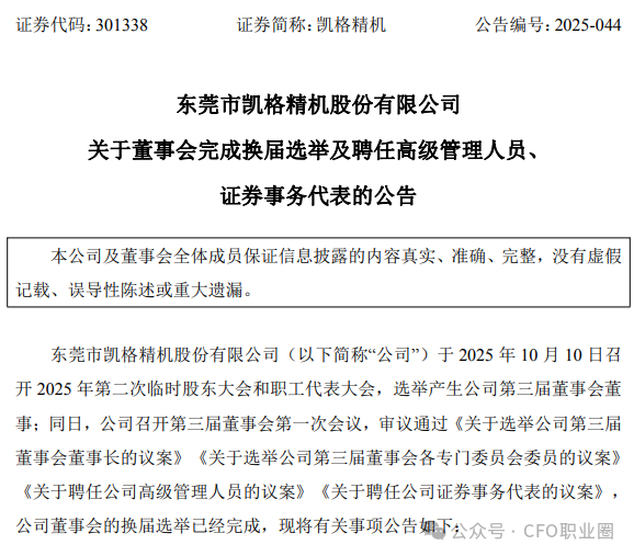 2025年10月10日晚间,深交所创业板上市公司凯格精机(301338.SZ)发布了《关于董事会完成换届选举及聘任高级管理人员、证券事务代表的公告》。公告显示,公司聘任邱靖琳女士为公司董事会秘书、财务总监。公告同时显示,邱靖琳女士与公司实际控制人、控股股东邱国良先生为父女关系;与公司实际控制人、控股股东彭小云女士为母女关系;与公司董事、副总经理邱昱南先生为兄妹关系。