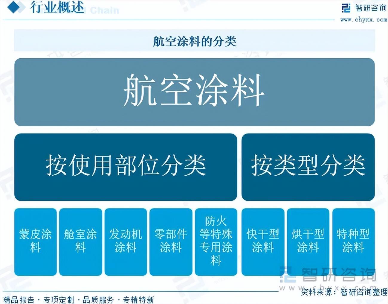 航空涂料是专用于飞机机身、发动机及零部件的特种涂料,对于飞机正常运行起到防水、防火、隔热、耐高温、耐低温、耐腐蚀、防腐蚀等作用。航空涂料对涂料的要求较为严格,如涂刷方便、干燥快、价格低,涂层重量轻等。按使用部位可分为蒙皮涂料、舱室涂料、发动机涂料、零部件涂料及隔热、防火等特殊专用涂料;按类型可分为快干型涂料、烘干型涂料、特种型涂料。