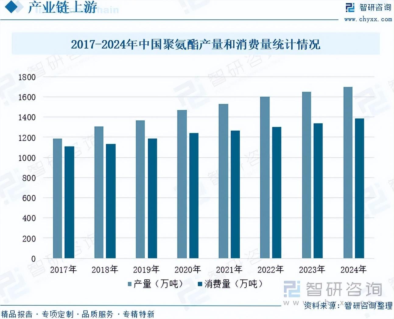 聚氨酯是航空涂料的重要原材料之一,凭借其优异的耐磨、耐冲击和耐候性能,能够在极端环境下保持良好的性能稳定性。随着国民经济水平的持续快速发展和居民生活消费水平的升级,聚氨酯市场需求持续旺盛。尤其是航空、家电、汽车等领域,对高性能聚氨酯材料的需求不断上涨。近年来,我国聚氨酯产量持续增长,稳居世界第一。数据显示,中国聚氨酯产量从2017年的1189万吨增长至2024年的1700万吨,年复合增长率为5.24%。从消费量来看,随着我国经济的高速发展,众多下游产业的扩张和消费升级对聚氨酯产品的需求不断增加,使得聚氨酯消费量从过去的较低水平迅速攀升。特别是近几十年,在建筑、汽车、家具、电子电器等行业发展的带动下,聚氨酯消费量增长显著。近年来,我国聚氨酯消费量持续增长,从2017年的1110万吨增长至2024年的1383万吨,年复合增长率为3.19%。