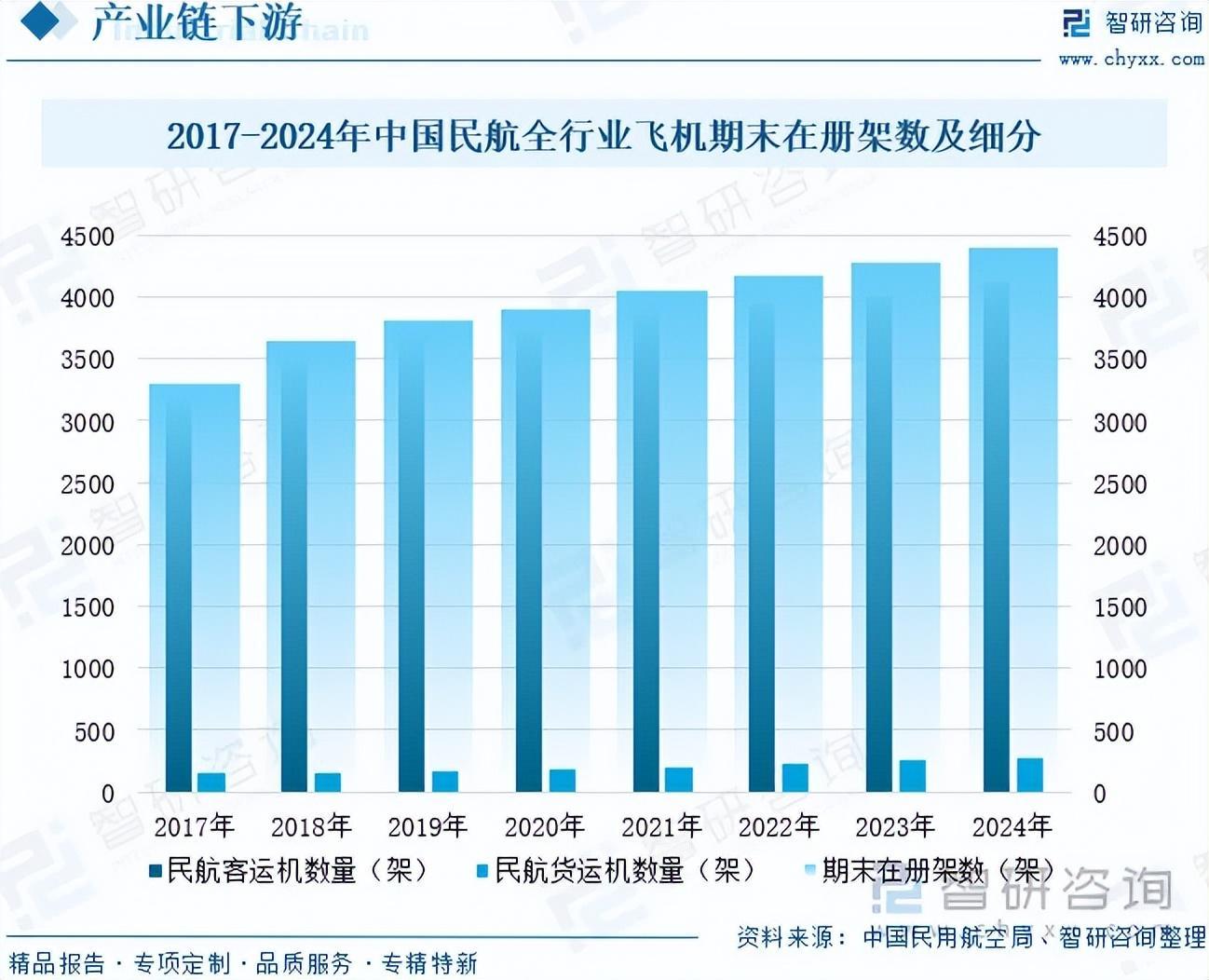 航空涂料主要应用于飞机制造领域,近年来我国民航飞机的数量不断增长,对航空涂料的需求也逐渐上升。中国民用航空局数据显示,2017-2024年中国民航全行业飞机期末在册架数逐年增长。截至2024年底,民航全行业运输飞机期末在册架数4394架,比2023年底增加124架。其中,民航客机是我国民航飞机的主要类型,占据主要市场份额,2024年我国民航客运机数量为4126架,较2023年底增加112架。民航飞机的另一大类型是民航货运机,随着交通物流和仓储行业的不断发展壮大,我国民航货运机数量也在不断增加。2024年我国民航货运机数量为268架,较2023年底增加10架。未来,随着我国民航机队规模的进一步扩大,上游航空涂料市场将迎来更广阔的发展空间。
