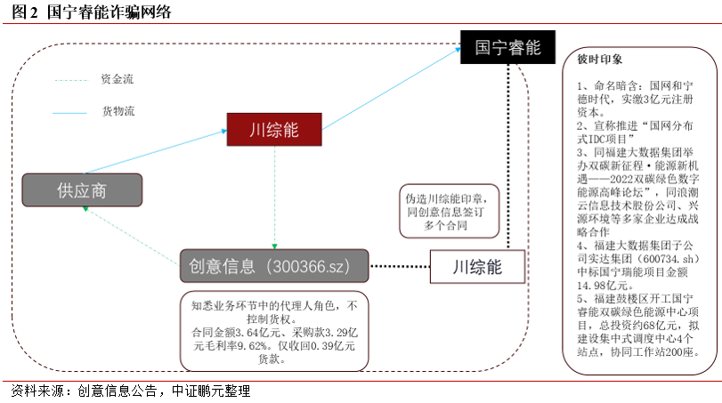 第二阶段:迅速垫款履约交付、苦苦催收。2022年11月25日在国宁睿能的安排下,创意信息同国网四川综合能源服务有限公司(以下简称“川综能”)签订7份销售合同,合同约定创意信息向川综能提供56套协同一体机产品及服务,合同金额3.64亿元,川综能货物的购买业主方为国宁睿能。2022年12月28日创意信息向供应商支付了全部设备采购款3.28亿元。2022年12月29日,川综能支付0.39亿元货款,但至2023年底未有回款,创意信息屡次催收后无果,2023年12月创意信息起诉国宁睿能,追加川综能及国宁睿能母公司为被告。