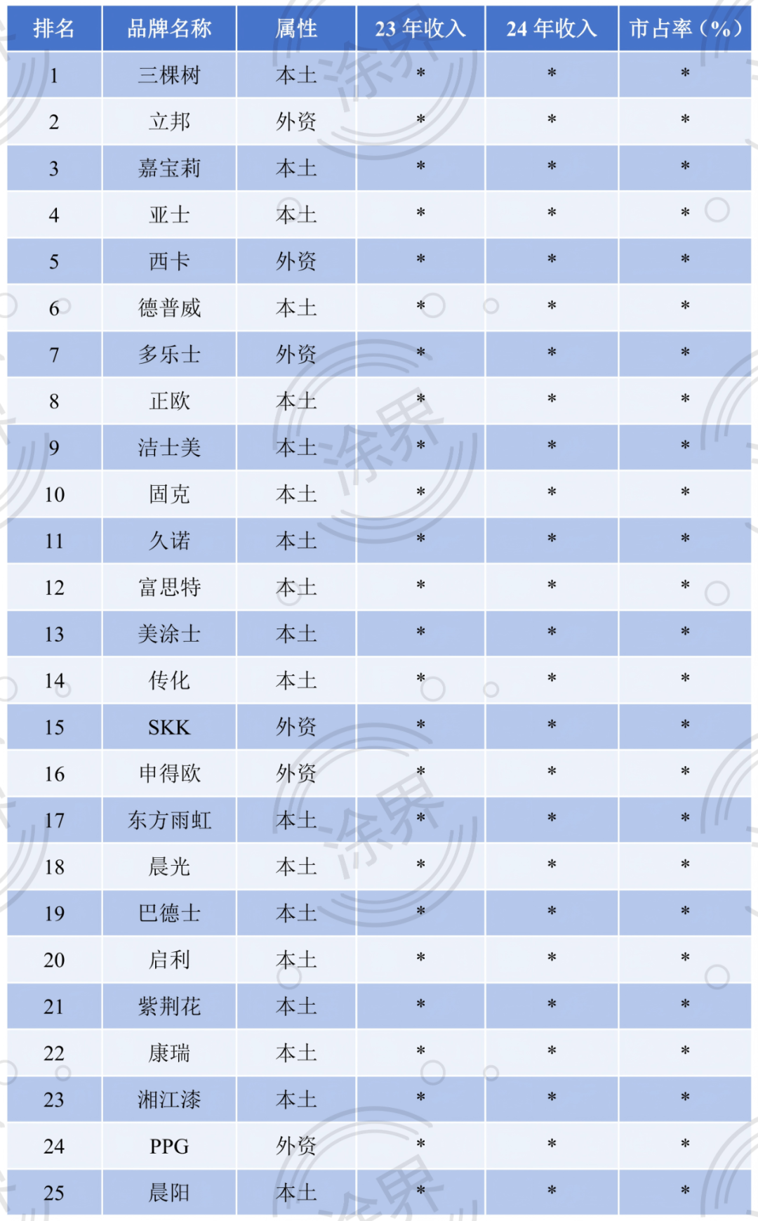 此外,嘉宝莉超越亚士跻身全国前三强,而亚士因去年工程业务销售收入大幅下滑,排名下滑了1位。根据财报,亚士工程建筑涂料业务营业收入2025年上半年出现大幅下滑,而嘉宝莉工程业务收入2025年上半年则同比大幅增长约20%。意味着两个品牌之间的收入差距将继续拉大。