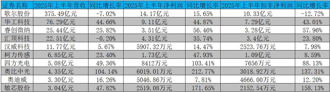 2025年上半年,歌尔股份实现营业收入375.49亿元,同比下降7.02%,主要受智能声学整机受产品迭代影响;归母净利润14.17亿元,同比增长15.65%;扣非净利润10.33亿元,同比下降12.72%。歌尔股份未单独披露歌尔微电子的财务状况,但根据歌尔微电子7月向港交所递交的招股书,其2025年第一季度营收为11.2亿元,较上年同期7.26亿元增长54%;毛利为2.3亿,同比增长42.9%。