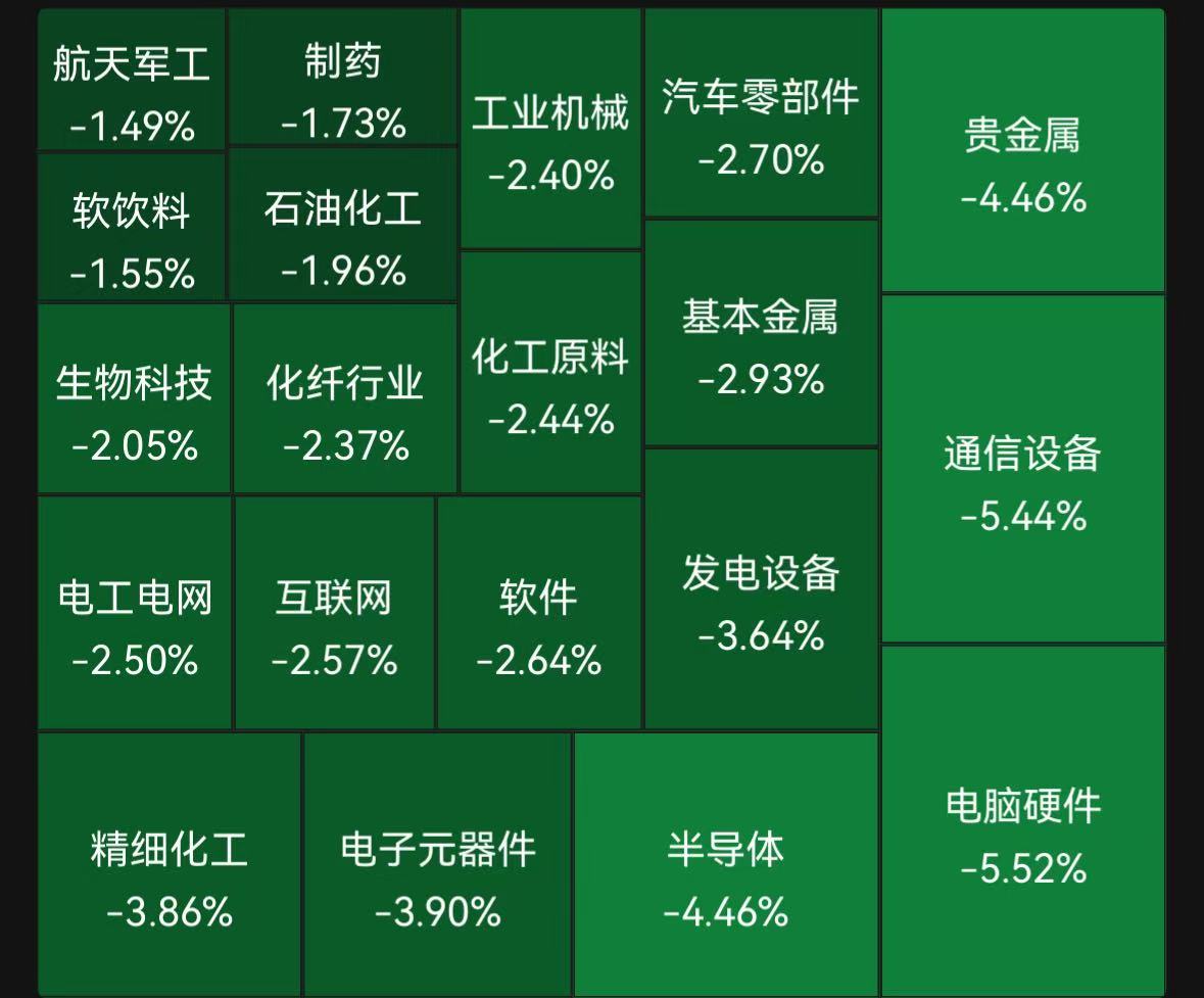 A股市场上,午后贵金属、有色金属个股应声下跌;截至当日收盘,贵金属行业板块下跌4.46%,基本金属板块收跌2.93%,其中盛达资源下跌8.39%、洛阳钼业、兴业银锡跌超7%、江西铜业下跌6.81%、紫金矿业下跌5.75%、四川黄金、赤峰黄金等多只个股跌超4%。