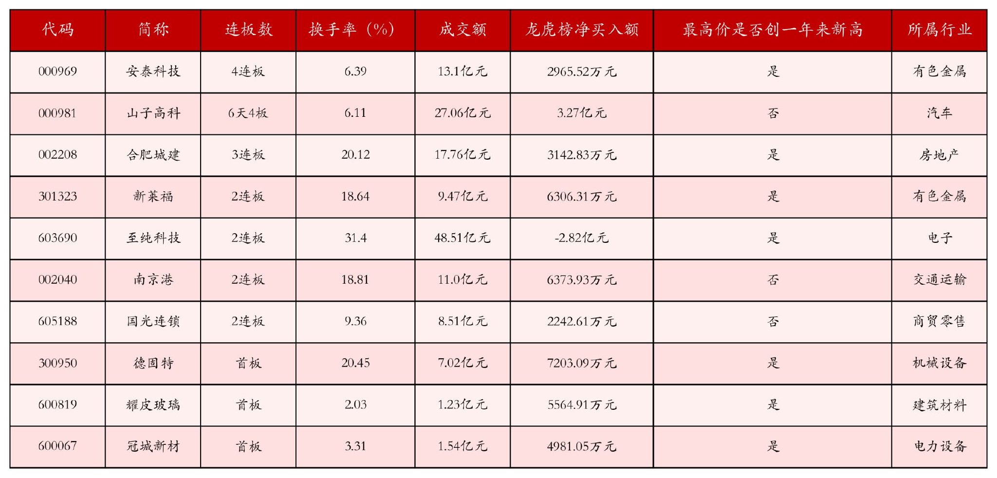 截至10月14日收盘,上证综指下跌0.62%,收于3865.23点,深证成指下跌2.54%,收于12895.11点,创业板指下跌3.99%,收于2955.98点。今日沪深两市A股共计45只涨停,综合当前连板数以及当日龙虎榜数据,其中较为强势的前三只个股分别为:安泰科技(000969)、山子高科(000981)与合肥城建(002208)。今日强势个股前10位具体数据见下表: