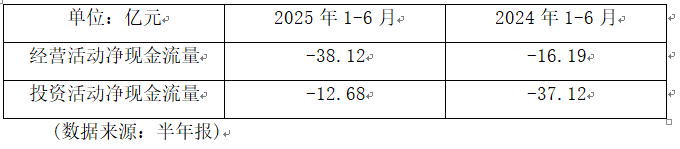 由于主营业务造血能力下降,叠加对外投资的巨额资金需求,今年上半年晶科能源经营活动净现金流量再度亮起红灯,净流出缺口从-16.19亿元扩大到-38.12亿元。