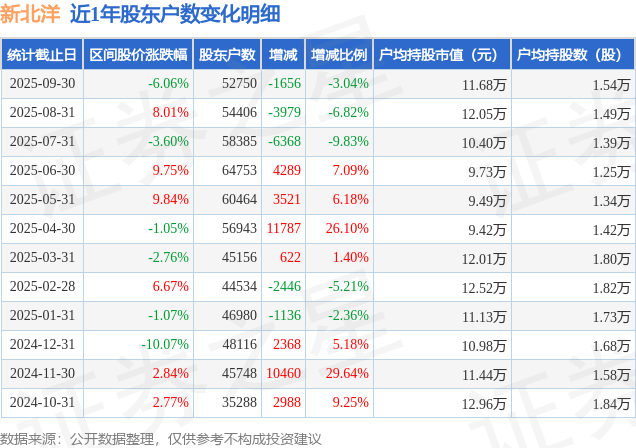 从股价来看,2025年8月31日至2025年9月30日,新北洋区间跌幅为6.06%,在此期间股东户数减少1656.0户,减幅为3.04%。