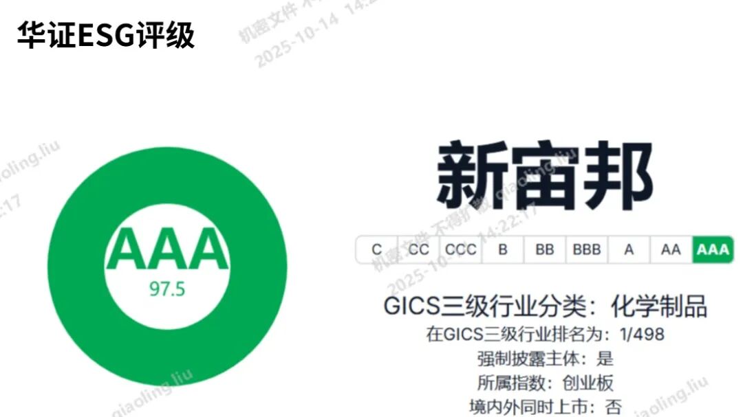 近期,华证指数公布了新一期(2025年7月31日)的ESG评级结果,新宙邦(300037.SZ)获得AAA评级,本期ESG评级在498家化学制品行业A股上市公司中排名第1。此前,新宙邦在ESG新引擎50指数评级中实现A级至AA级的跨越,在172家多元化工行业中排名第1,成为资本市场认可的ESG标杆企业。