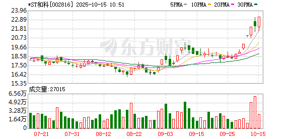 *ST和科再度涨停,5个交易日内录得4个涨停,累计涨幅为21.73%,累计换手率为16.59%。截至10:14,该股今日成交量260.52万股,成交金额5803.57万元,换手率2.61%。最新A股总市值达23.19亿元。