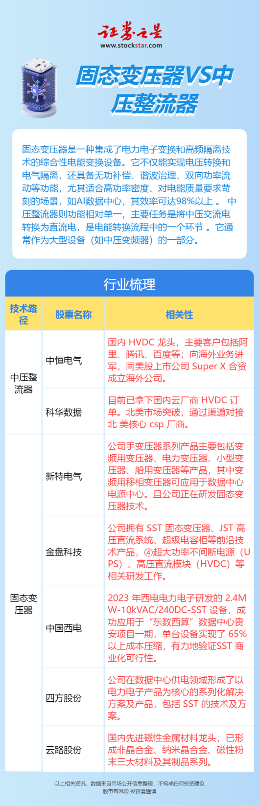 总体而言,SST与中压整流器在国内分别处于前瞻布局和规模化应用的不同阶段。中压整流器及相关HVDC技术是满足当前AI算力中心快速部署需求的现实选择;而SST则代表了供电架构的远期进化方向,其产业化进程仍取决于材料、芯片及散热等核心环节的持续突破与成本优化。