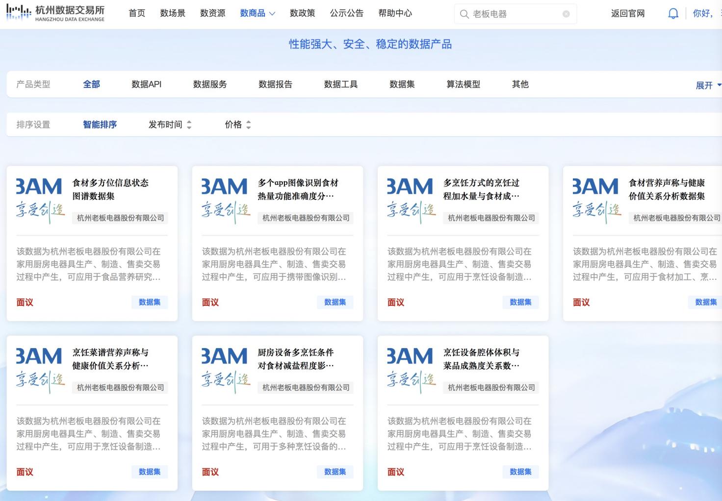 打开杭州数据交易所网站,老板电器7大数据产品赫然醒目:食材多方位信息状态图谱数据集、多个App图像识别食材热量功能准确度分析数据集、多烹饪方式的烹饪过程加水量与食材成熟重量损失分析数据集、食材营养声称与健康价值关系分析数据集、烹饪菜谱营养声称与健康价值关系分析数据集、厨房设备多烹饪条件对食材减盐程度影响数据集、烹饪设备腔体体积与菜品成熟度关系数据集。