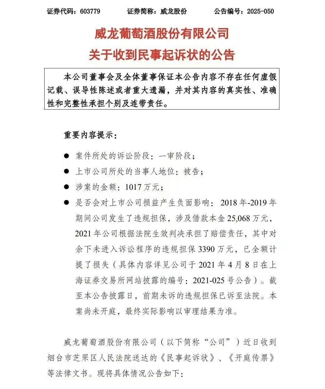 葡萄酒的醇香难掩债务的苦涩。日前,威龙葡萄酒股份有限公司(下称“威龙股份”)的一则公告打破了行业的平静,公司因一起历史担保纠纷被诉至法院,原告要求其承担1017万元的补充赔偿责任。这起看似孤立的诉讼,实则是威龙股份多年前违规担保“旧雷”的再度引爆,也揭开了这家老牌葡萄酒企业的治理疮疤。