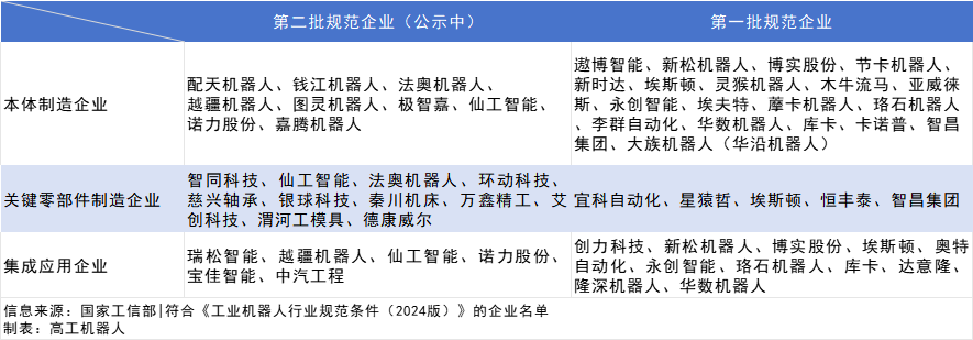在新规发布当年的12月份,工信部就公布了第一批规范企业名单,包括新松机器人、埃斯顿、库卡、新时达、卡诺普、藦卡机器人、埃夫特、遨博智能、珞石机器人、华沿机器人等27家机器人企业入选。