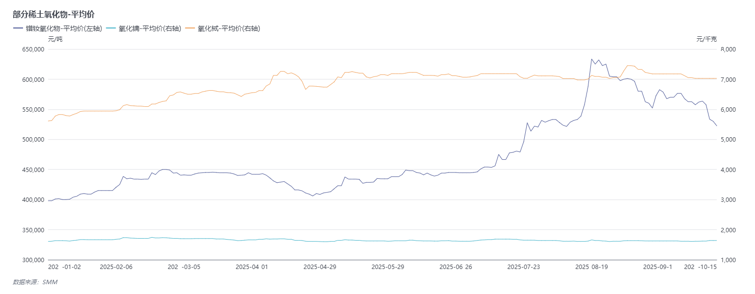以氧化镨钕价格历史价格走势为例,据SMM报价显示:氧化镨钕9月30日的均价为562000元/吨,与其8月29日的均价597500元/吨相比,一个月的时间里下跌了35500元/吨,跌幅为5.94%。进入10月,氧化镨钕跌多涨少,10月15日,氧化镨钕均价为522500元/吨。
