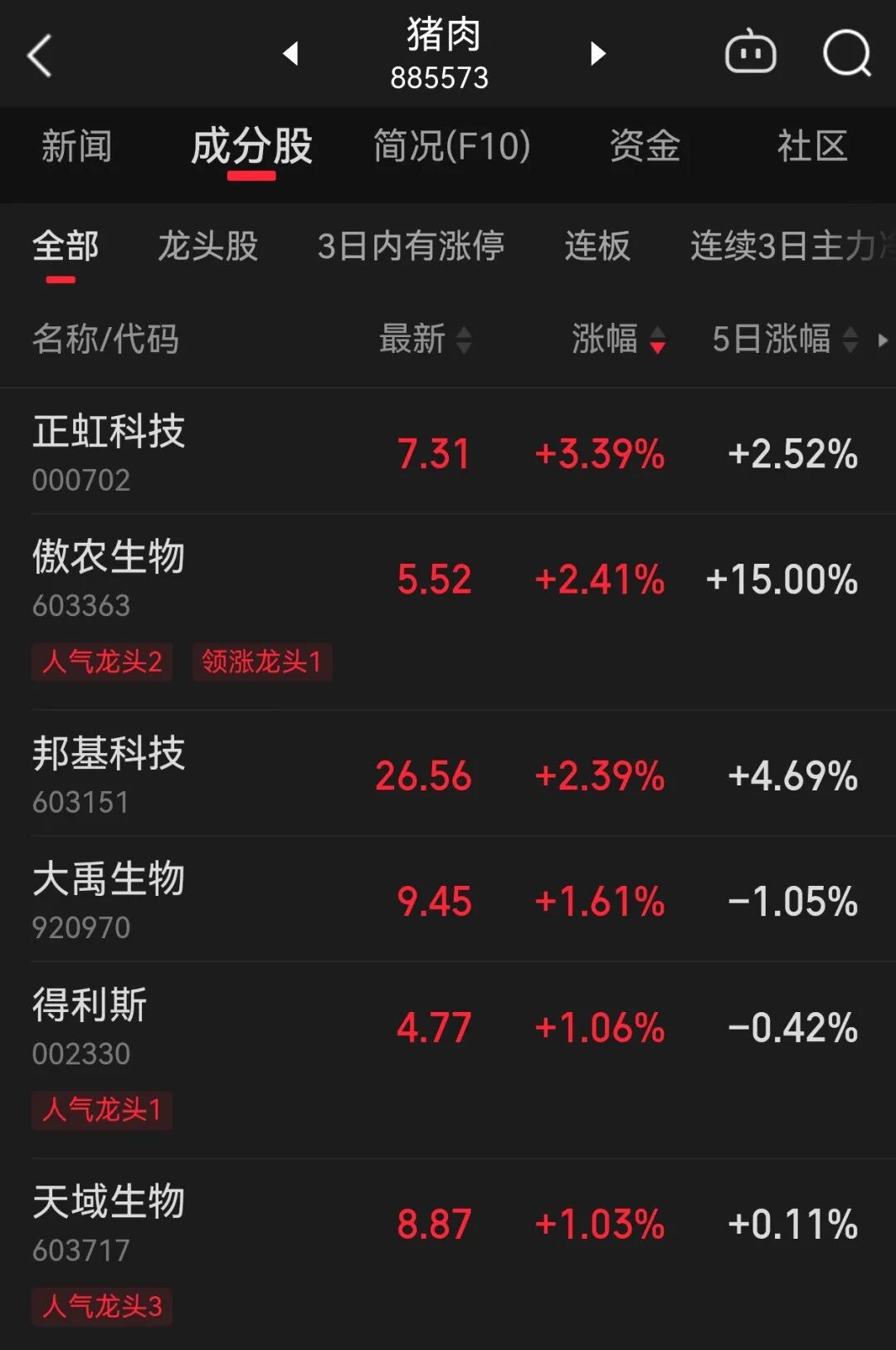 A股猪肉概念股10月15日表现活跃,正虹科技、傲农生物(维权)和邦基科技等股价涨幅超2%。如正虹科技今日涨幅达3.39%;傲农生物5天涨幅达15%。这也从侧面反映出资本对头部企业抗风险能力的认可。