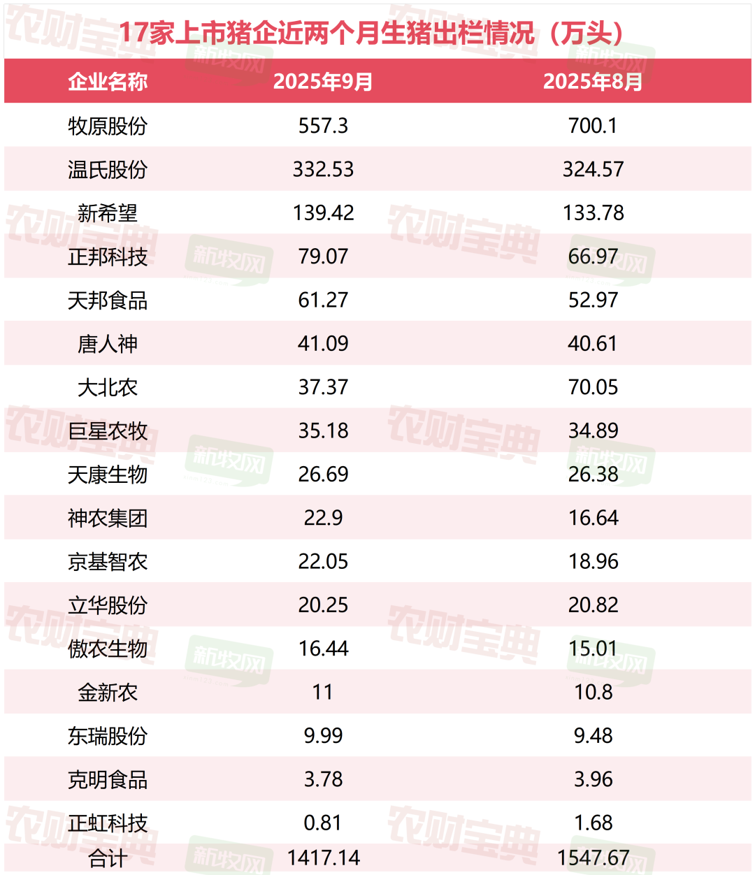 其一,供应端主动收缩。北方养殖端抗价情绪显著增强,散户出栏量减少,规模场如牧原股份、大北农等主动调减月度出栏量。农财宝典新牧网数据显示,17家上市猪企9月生猪总出栏量较8月减少了130多万头。