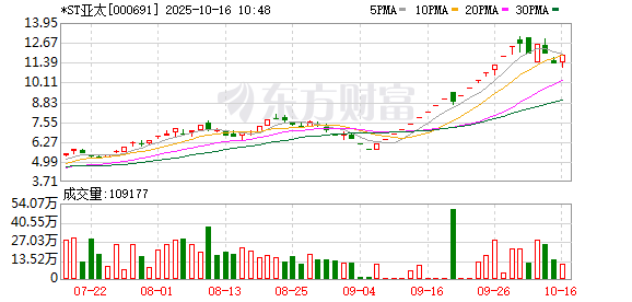*ST亚太(维权)再度涨停,23个交易日内录得18个涨停,累计涨幅为103.95%,累计换手率为86.62%。截至10:03,该股今日成交量1025.54万股,成交金额1.18亿元,换手率3.17%。最新A股总市值达38.44亿元。